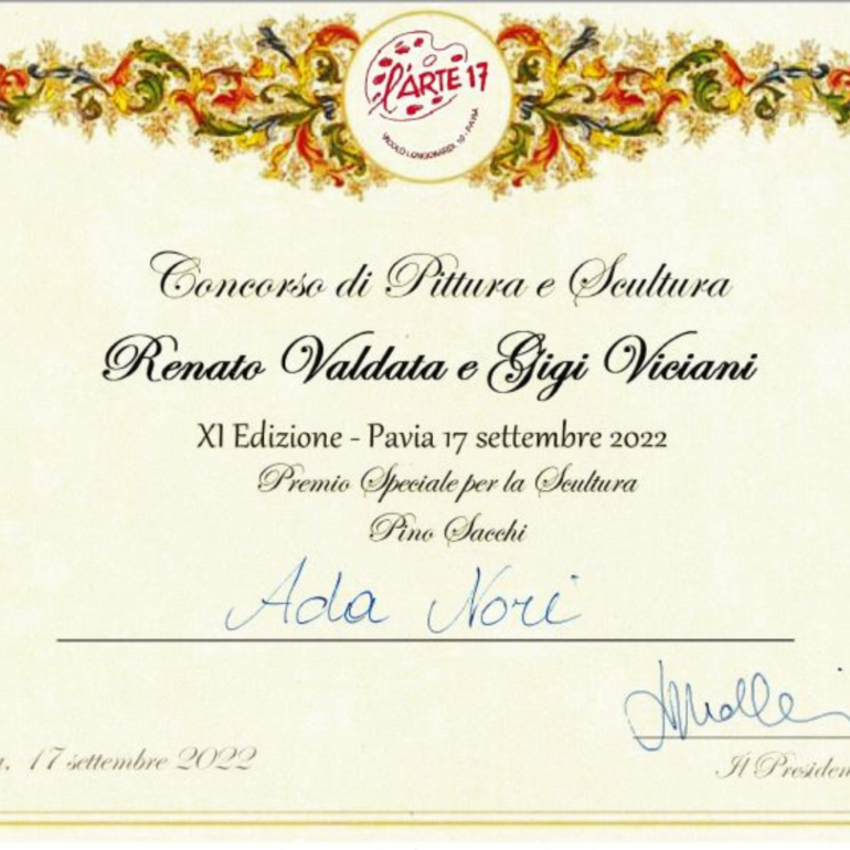 Onorata di aver vinto il Premio speciale per la scultura al Concorso Renato Valdata e Gigi Viciani promosso da Arte 17. Pavia