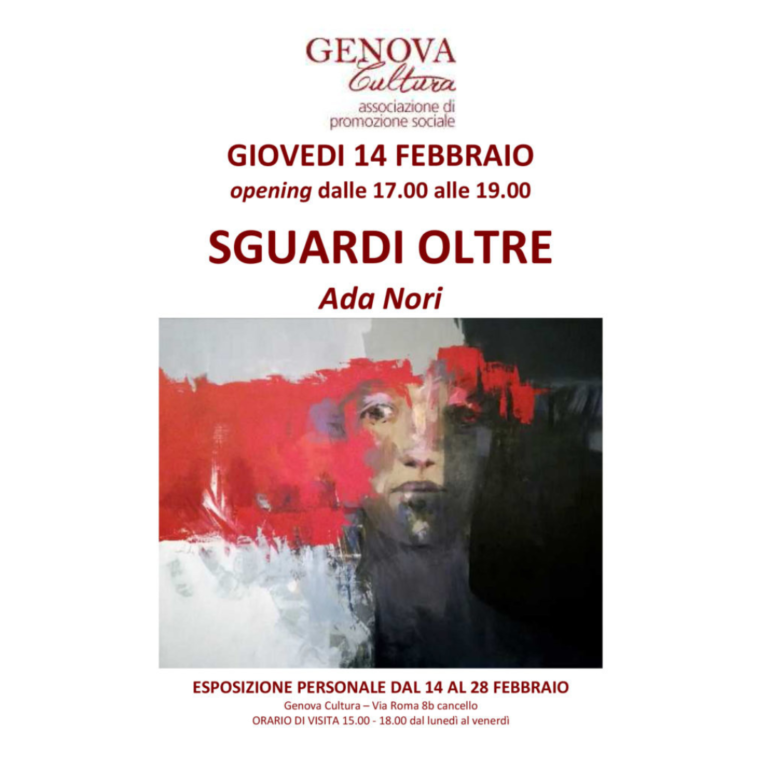 “Sguardi oltre” presenta una rassegna di opere figurative che virano verso l’astratto. Si tratta di figure enigmatiche, rivelatrici di inquietudine e insieme di forza; ognuna assorta nella propria situazione emotiva, ma tutte accomunate dalla volontà di andare oltre i propri limiti per afferrare quel qualcosa che si percepisce ma che resta comunque insondabile. La mostra si svolgerà presso la sede di Genova Cultura. Inaugurazione giovedì 14 febbraio.