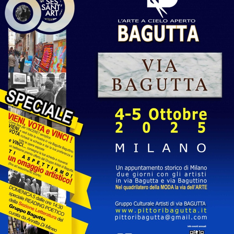 L'arte a cielo aperto, alla 122^ edizione della mostra di Via Bagutta, un appuntamento storico di Milano dal 1964. 4 e 5 ottobre 2025, in Via Bagutta. La mia postazione è la numero 6. Esporrò cinque tele recenti e le ultime sculture.