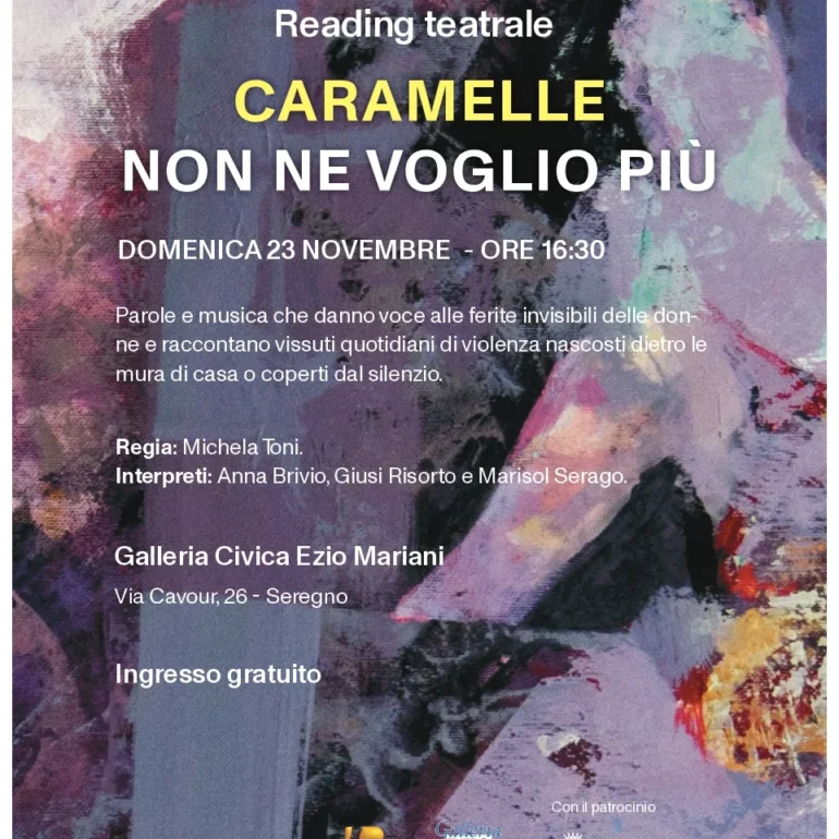 Durante il finissage della mia mostra Ungravity, presenteremo il reading teatrale CARAMELLE NON NE VOGLIO PIU', parole e musiche sulla violenza di genere più sottile, quella meno raccontata ma non per questo innocua. Alla Galleria civica Mariani di Seregno. Domenica 23 novembre, alle 16.30. Con Anna Brivio, Marisol Serago, Giusi Risorto Alle musiche: Adriano Rovaris Regia di Michela Toni
